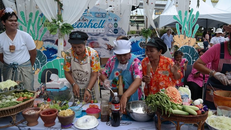 #ประจวบโพสต์นิวส์ สาวน้อยสาวใหญ่หัวหิน โชว์ฝีมือและลีลาควงครก ควงสากสุดมัน ในการแข่งขันตำยำหอยลีลา สร้างสีสันในงาน เทศกาลกินหอยที่หัวหิน ครั้งที่ 4 ที่มาร์เก็ตวิลเลจ หัวหิน กระตุ้นท่องเที่ยวหัวหิน