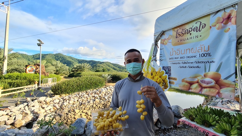 ในช่วง 2 ปีที่ผ่านมา สถานการณ์โควิด-19 ที่เกิดขึ้นยิ่งทำให้ ได้มีโอกาสใช้เวลาว่างและวันหยุด ลงมือทำไร่แห่งนี้ด้วยตนเอง กับครอบครัวมีคนงานไม่กี่คน อาศัยทำเองเป็นหลักทุกอย่าง ปีนี้อินทผลัมให้ผลผลิต 23 ต้นประมาณ 400 กก.มากกว่าปีที่แล้วเกือบเท่าตัว คาดว่าในปีต่อๆไปผลผลิตก็จะมีเพิ่มขึ้นอีก ซึ่งแต่ละต้นก็จะใช้ถุงกระดาษห่อเอาไว้แต่ละต้นก็จะมีประมาณ 5-7 ช่อ โดยในปีนี้ผลผลิตทยอยออก และตัดเก็บได้ทุกวันไปจนถึงประมาณกลางเดือนกันยายน แต่ยอมรับว่าปีนี้ ราคาตกลงมาเหลือเพียงกิโลกรัมละ 300 บาทเท่านั้น เมื่อปีที่ผ่านมาราคาขายอยู่ที่กิโลกรัมละ 500 บาท ซึ่งแต่ละช่อจะมีน้ำหนักเฉลี่ยตั้งแต่ 3-10 กก. เมื่อผลผลิตออกเมื่อแก่จนได้ที่ตนเองก็จะตัดและนำมาให้ภรรยา บรรจุลงกล่องติดสติ๊กเกอร์” อินทผลัมสด ไร่รักสุดใจ หัวหิน” วางจำหน่ายอยู่หน้าไร่ตั้งแต่ต้นเดือนสิงหาคม ที่ผ่านมา