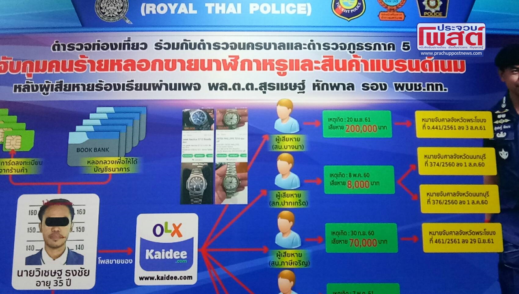 เมื่อเวลา 11.00 น.วันที่ 4 ส.ค.61 ที่ สภ.ปากเกร็ด จ.นนทบุรี พล.ต.ต.สุรเชษฐ์ หักพาล รอง ผบช.ทท. พร้อม จนท.ตำรวจท่องเที่ยว ตำรวจ 191 และตำรวจศูนย์ปราบปรามอาชญากรรมทางเทคโนโลยีสารสนเทศ สำนักงานตำรวจแห่งชาติ (ศปอส.ตร.) สภ.ปากเกร็ด และสภ.สามพราน แถลงข่าวจับกุมผู้ต้องหาตามหมายจับของศาลจังหวัดนนทบุรี คดีโพสต์ขายสินค้านาฬิกา กระเป๋าหรูแล้วเชิดเงินหลบหนี ซึ่งก่อเหตุในหลายพื้นที่ มูลค่าความเสียหายกว่า 400,000 บาท และจับกุมผู้ต้องหาลักรถของนายจ้างแล้วฉุดหญิงสาวชาวลาวไปข่มขืนกระทำชำเรา โดยสามารถช่วยเหลือหญิงสาวดังกล่าวจนปลอดภัยและติดตามจับกุมผู้ต้องหาได้ ซึ่งทั้งสองคดีได้ร้องเรียนและติดต่อขอความช่วยเหลือผ่าน facebook พล.ต.ต.สุรเชษฐ์ หักพาล รอง ผบช.ทท.