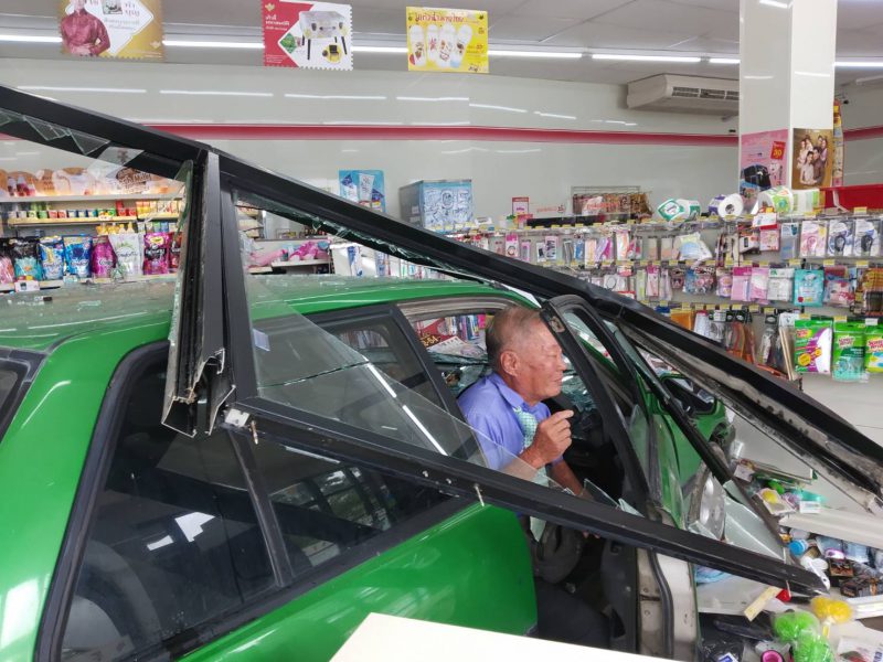 เข้าเกียร์ผิด!! ลุงวัย 68 ปี ขับเก๋งพุ่งเข้าร้าน 7-11 ย่านบางบัวทอง นนทบุรี พังเสียหาย