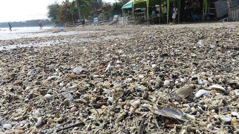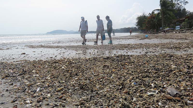 คลื่นทะเลซัด “หอย สาหร่ายทะเล ขยะ” เกยหาดหัวดอน อ.หัวหิน