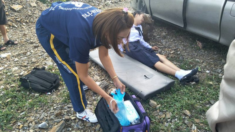 จากการสอบถามนายสันติ คนขับรถ เล่าให้ฟังว่า ตนขับรถนักเรียนมาจากบ้านบ้านพุน้อย หัวตาลแถว พุใหญ่ จำนวน 18 คน กำลังไปส่งที่โรงเรียน ขณะวิ่งมาถึงที่เกิดเหตุเกิดยางหลังข้างซ้ายเกิดระเบิดแล้วรถเกิดสะบัด แล้วตกข้างทางพยายามประคองรถแต่เอาไม่อยู่ ระหว่างนั้นจึงประคองไว้ไม่ให้รถคว่ำ เมื่อมาเจอหินขนาดใหญ่ 2 ก้อนก็พยายามไม่ให้ชนและให้รถโดนด้านข้าง จึงทำให้มีนักเรียนได้รับบาดเจ็บ 10 คน บาดเจ็บเล็กน้อย ถลอก เคล็ดขัดยอก แต่มีคนเดียวที่มีอาการปวดหลัง ส่วนนักเรียนคนอื่นๆที่ไม่ได้รับบาดเจ็บก็สามารถไปโรงเรียนๆได้ตามปกติหลังจากนี้เจ้าหน้าที่ตำรวจก็จะเรียกตัวผู้ขับขี่และนักเรียนมาสอบสวนอย่างละเอียด โชคดีที่อุบัติเหตุครั้งนี้ไม่มีผู้ได้รับบาดเจ็บสาหัสและเสียชีวิต